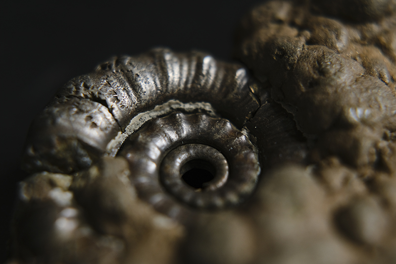 The original creature that was swimming around, wasn’t made of pyrite, of course. This process, called pyritization, can happen to dead ammonites buried in sediment saturated with iron sulfides. These sulfides are produced by decaying organisms and can react with iron to form pyrite (FeS2)– and this slowly takes the place of calcium carbonate from which the shell was made. Once released from the sediment by mudslides and seawater, this pyritized fossil will start to oxidize and slowly disintegrate.